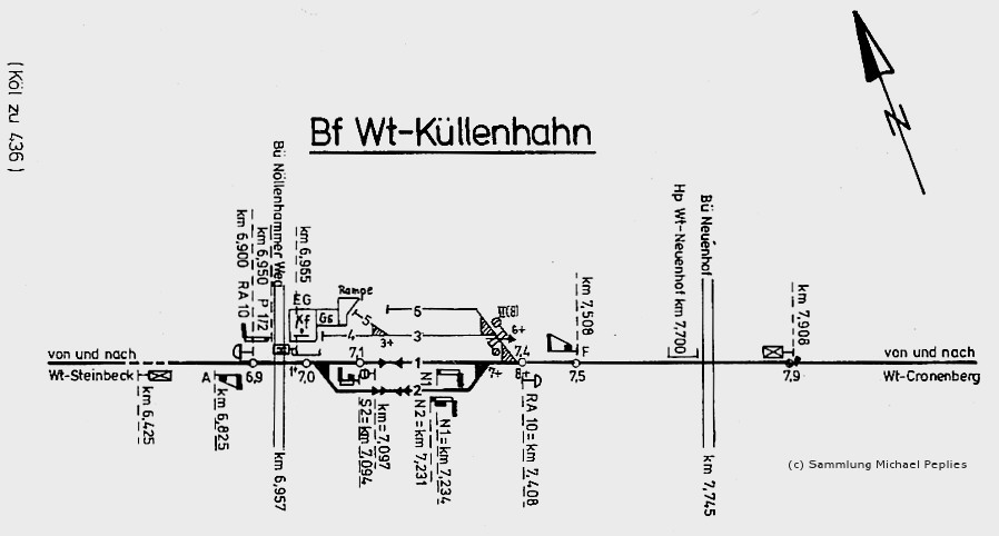 Der Bahnhof Küllenhahn in seiner größten Ausdehnung (Plan von etwa 1910), wobei sich die Gleise erst “jenseits” vom eingleisigen Personenbahnsteig zum Güterbereich hin entwickeln. Rechts unten entdeckt man auch den An- schluss der Fa. Triches (etwas südlich liegt der Steinbruch). Das Schaubild entstammt dem “Betriebsplan für die Nebenbahn Elberfeld-Steinbeck - Cronenberg”, verfasst von der Deutschen Reichsbahn-Gesellschaft, Reichsbahn- direktion Elberfeld, in der Ausgabe von 1929. Zum damaligen Zeitpunkt gehörte der Bezirk Küllenhahn noch zur selbstständigen Werkzueg-Stadt Cronenberg, aber unmitelbar an der Grenze zu Elberfeld liegend. Der nächste Plan enthält zwar noch weitgehend die Gleise, aber ihre Bedeutung hat die Cronenberger Linie längst verloren. Vorlage Sammlung Uli Schimschock