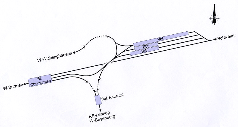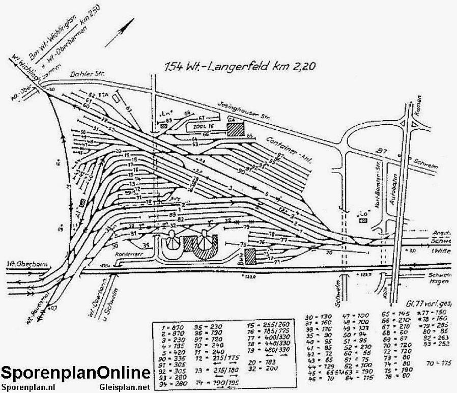 | Infoecke: Bahnhof Langerfeld (Westf.)/Wuppertal-Langerfeld im Überblick 1. Bau und Lage: Der Bahnhof liegt an der Hauptstrecke von Düsseldorf/Köln nach Hagen. Der Standort der alten Personenstation bei Km 2,20 bezieht sich auf die eigentliche Güter-Verbindungsbahn von Barmen-Rittershausen/ Wt-Oberbarmen nach Schwelm. Die neue Personenstation bei Km 45,2 orientiert sich an der S-Bahnverbindung von Neuss nach Schwelm (eigene Nahverkehrsgleise). Einen Personenbahnhof an der alten BME-Fernbahn hat es nie gegeben. Mit Eröffnung der ersten BME-Strecke Elberfeld - Dortmund anno 1848 und und auch mit der Verbindungsstrecke Rittershausen bzw. Rauenthal - Wichlinghausen wurde Langerfeld für Jahrzehnte quasi links liegen gelassen. Erst bis 1910 wurden hier ein Verschiebe- bzw. Güterbahnhof und Wagenabstellanlagen (sowie das Bw) angelegt, was auch eine Entlastung der Rittershauser/Oberbarmer Anlagen war. Nach unseren Unterlagen wurde die Personenstation neben der alten Wagenhalle erst 1948 angelegt, ziemlich primitiv mit nur einem Gleis und unbequemen Zugang durch den Straßentunnel. Ein erstes Container-Terminal wurde am 10.7.1969 eingeweiht, ein zweites folgte zum 19.3.1980. Die anderen Güterleistungen wurden wie überall im Tal sukzessive abgebaut. Im Mai 1988 bekam Langerfeld endlich eine gebührende S-Bahnstation, parallel der Ferngleise. Die Umstrukturierungen im Regional- und besonders S-Bahnverkehr seit Ende der 1980er Jahre machten die Abstellanlagen für die Züge bald auch überflüssig. Heute werden bis auf den Containerbereich nur einige Gleise zeitweise genutzt. Das Bw war nach Elektrifizierung der Talstrecke bereits Anfang Juni 1964 aufgegeben worden. 2. Betriebliches: Personenmäßig war und ist Langerfeld immer ein Bahnhalt für den Nahverkehr gewesen. Vor der S-Bahnzeit war man an etliche regionale Züge nach Hagen oder Gevelsberg Nord angebunden, die den Schlenker über diese Station nahmen. Allerdings erbrachte der Wagenabstellbahnhof sehr wichtige Zugbildungsaufgaben, vor allem für in Rittershausen/Oberbarmen beginnden Züge westwärts durchs Tal. Der Verschiebebahnhof hatte einst eine bedeutende Pufferfunktion, da durch die spezielle Gleisentwicklung die Güterzüge aus Richtung Remscheid, von der BME-Talstrecke, aus Richtung Hattingen - Wichlunghausen sowie aus Hagen - Schwelm den Bahnhof direkt anlaufen konnten. Der Containerbahnhof hat (mit zeitweiligen Höhen und Tiefen) bis in die heutige DB AG-Zeit eine wichtige Funktion zu erfüllen, nicht zuletzt wegen seiner perfekten Anbindung zur Autobahn gleich nebenan. 3. Bezeichnungen: Langerfeld war bis 1922 eine eigenständige Gemeinde in der Provinz Westfalen. Die ersten Bezeichnungen nach 1910 weisen den (Güter-)Bahnhof dann auch entsprechend mit diesem Zusatz aus - wie das bei vielen “Grenzorten” damals üblich war. Nach Eingemeindung in die rheinische Nachbarstadt bekam man für wenige Jahre den Namen “Barmen-Langerfeld”. Nach Umzeichnungaktionen der Reichsbahn zum 1.8.1930 besitzen alle Bahnhofsteile die Kennung als “Wuppertal-Langerfeld”.Die Angaben und Daten stammen aus verschiedenen Veröffentlichungen