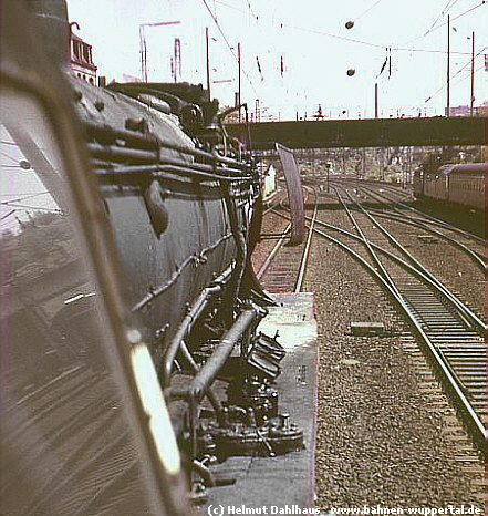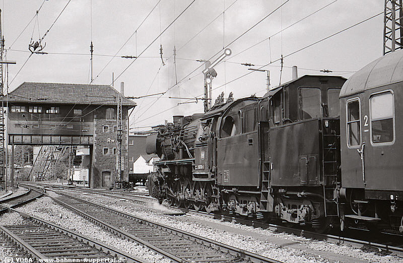 Nicht nur alte Zeiten im Bahnhof Wt-Oberbarmen, sondern auch Urzeiten der Bahnfotografie. Zumindest für einige VOBA-Leute, denn die gingen anno 1965 zum ersten Mal mit der Kamera auf Pirsch. Im Tal war die Strecke zwar seit einem Jahr elektrifiziert, aber einige Dampfleistungen gab es noch. Zu denen gehörten die P-Züge nach Remscheid, die in der Regel von Vohwinkler preußischen T 18 (78.0) bespannt waren. Einige Kurse aus Essen wurden gar mit den Neubaumaschinen der Reihe 65 gefahren. Rechts sind Teile vom Stellwerk Rs (Rittershausen Süd) und Hallen von der Güterverladung zu erkennen, dahinter prangt im Dunst das Wahrzeichen von Heckinghausen, damals noch in Betrieb. Fotoanfänge mit bescheidenen Kameras - wahrscheinlich wie bei so vielen -, aber mit einem speziellen Stellenwert. Foto VOBA