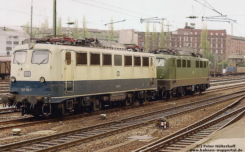 Die Natur hat ihr Frühlingserwachen, was man von den beiden Loks der Reihe 140 nicht behaupten kann. Die haben wahrlich schon bessere Zeiten gesehen. Wir sind um 1990 zum Bahnhof Oberbarmen gewandert, wo der Frachten- bf. mit Abstrichen noch in Betrieb ist. Rechts hinten sehen wir das Stellwerk Rr (Rittershausen Rangierbahnhof). Foto Peter Hölterhoff
