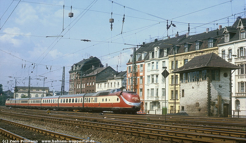 Soweit wir Kursbuchunterlagen auswerten konnten, haben Fernschnellzüge in der Station nie planmäßig gehalten, sondern mussten dies den Elberfeldern überlassen. Im Bild der beliebte TEE-Triebwagen VT 11.5 in zeitloser Eleganz. Vor den Höfen-Häusern steht das östliche Stellwerk Ro (Rittershausen Ost). Die Fahrzeuge vom Typ 601/602 fuhren zu Ende der 1960er/Anfang der 1970er Jahre im so genannten IC-Vorlaufbetrieb zwischen Köln und Hannover. Man experimentierte mit ersten vertakteten Fernverbindungen. Hier ein Foto eines Tw der Reihe 602 vom Frühjahr 1977. Foto Zeno Pillmann