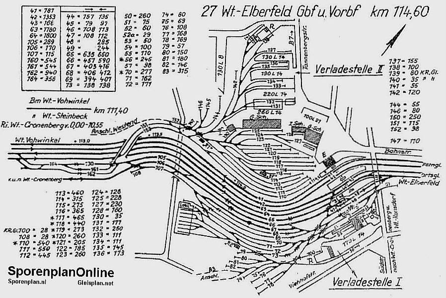 1. Bau und Lage: Der Bahnhof liegt an der Hauptstrecke von Düsseldorf/Köln nach Hagen. Der Standort bei Km 114,60 bezieht sich auf die alte durchgehende BME-Kilometrierung von Aachen nach Kassel. Die Angabe von km 37,4 bei den Nahverkehrsgleisen betrifft die separate S-Bahntrasse von Neuss nach Schwelm. Mit km 0,0 begann hier die Cronenberger Linie. Eingerichtet wurde er als Endpunkt von der Düsseldorf-Elberfelder Eisenbahngesellschaft zum 1.9.1841 als erster Bahnhof in der Stadt Elberfeld. Eine Verbindung zum später gebauten, nicht einmal einen Kilometer entfernten Bahnhof der Bergisch-Märkischen Eisenbahngesellschaft am Döppersberg konnte erst nach Durchstich eines Abhangs zum 28.12.1848 eröffnet werden. Gegenüber vom Personenbahnhof gab es eine Lokstation, die später zur Betriebswerkstätte ausgebaut wurde, ebenso erfolgte die Erweiterung der Güteranlagen. Abzweigstation wurde man zum 1.4.1891, als die Nebenbahn nach Cronenberg hinauf in Betrieb kam. Sehr große Umbauten sind zwischen 1910 und 1915 in Zusammenhang mit dem viergleisigen Ausbau der Talstrecke zu verzeichnen, nicht nur mit der Vergrößerung der Personenstation und der Verlegung des Bahnwerks. Westlich am Kiesberg kam oberhalb der Hauptstrecke ein vom/zum Bahnhof Zoo zu befahrender sog. Vorbahnhof hinzu. Dadurch war es möglich, kreuzungsfrei sowohl südlich in den Verschiebebahnhof und zur Ladestraße als auch nördlich zu den Güterrampen zu gelangen. Bereiche vom Bahnhof wurden im Zweiten Weltkrieg bei Bombenangriffen nicht verschont. Außer den üblichen Gleisrückbauten und Funktionsaufgaben wie bei den meisten Bahnhöfen gab es dann erst wieder Umbauten in Zusammenhang mit der Eröffnung der S-Bahnlinie 8 zum Mai 1988, vor allem an den Bahnsteigen. Speziell kassierte man den Fernbahnsteig und degradierte den Bahnhof endgültig zu einer einfachen Nahverkehrsstation. Im ehemaligen Verschiebebahnhof liegen noch einige Gleise, wo zuweilen Loks oder Bauzüge abgestellt werden. Allerdings gibt es noch Gleise für einen Anschlussverkehr (s. Punkt 2). Auf dem Areal vom Güterbahnhof wurde die “Steinbecker Meile” erbaut - quasi als zeitgemäße Güterverteilung.