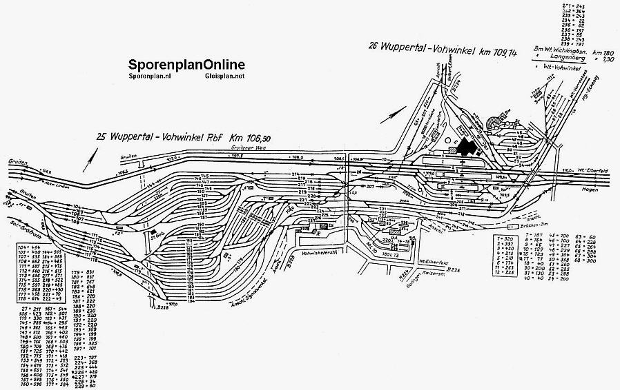 Gleisschema Bahnhof Wuppertal-Vohwinkel (1955, Modellbahn-Epoche 3) Rbf = Rangierbahnhof, Bw = Bahnbetriebswerk, Abstbf. = Abstellgruppe, Pbf = Personenbahnhof, EG = Empfangsgebäude Grafik Frank Pötter